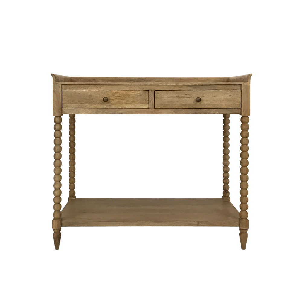 - turned wooden spindle legs with 2 drawers and a bottom shelf
