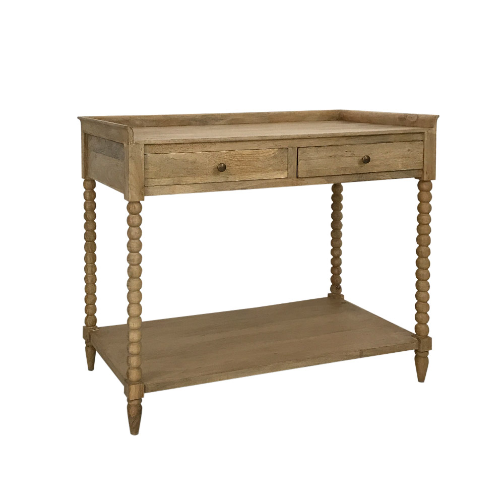 - turned wooden spindle legs with 2 drawers and a bottom shelf