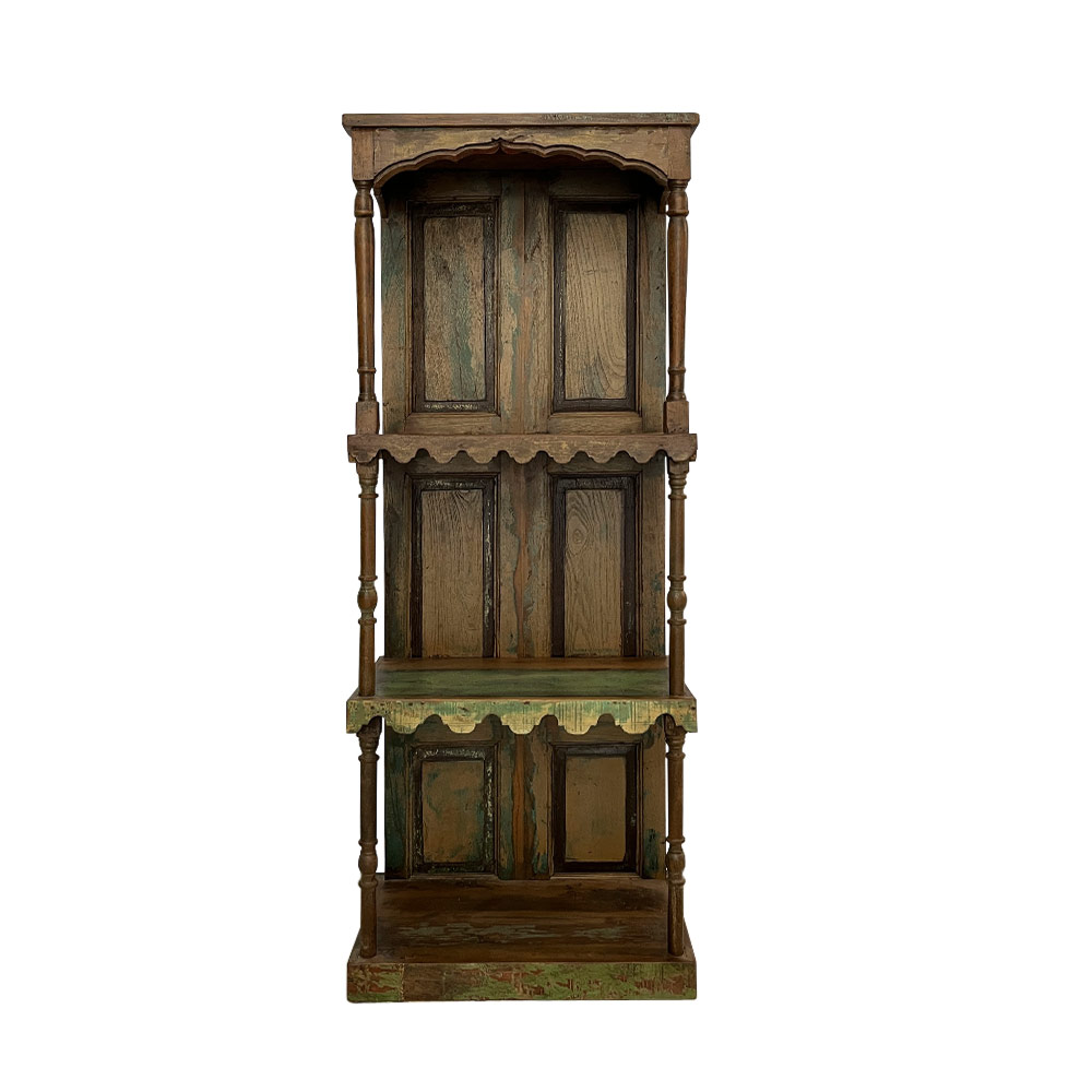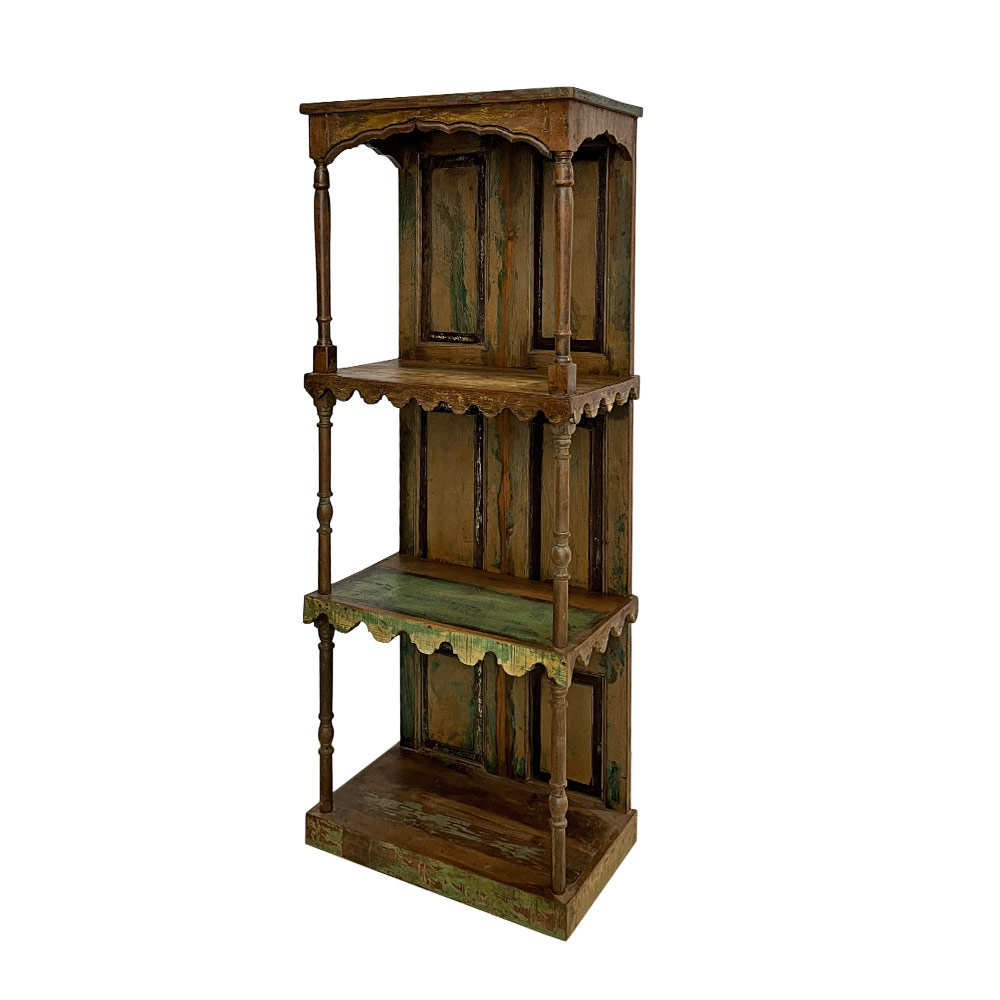 - original hand-carved bookcase with spindle columns, panelled back and x2 shelves with carved apron topped with a Mugal style arched roof