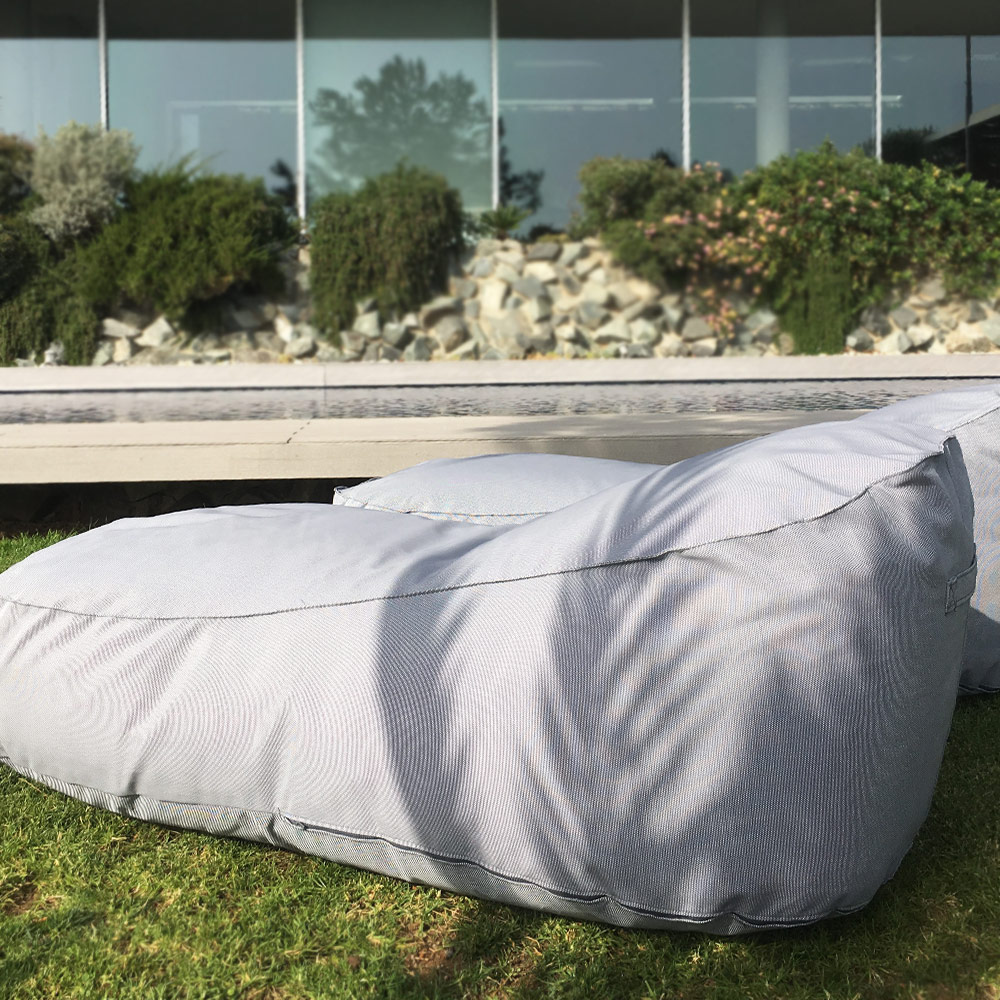 - waterproof polyester with interior liner cushions filled with styrofoam beads and heavy-duty waterproof zips