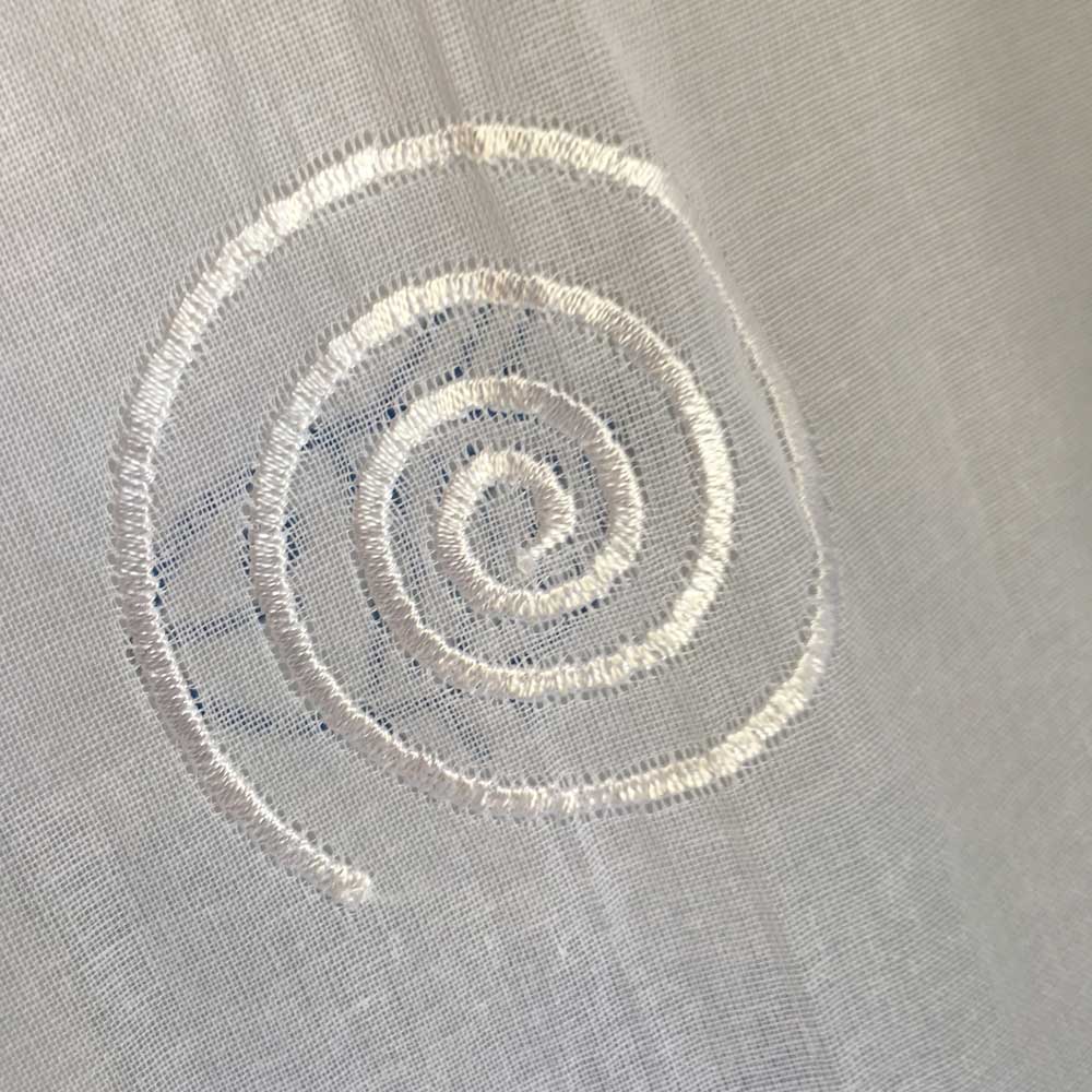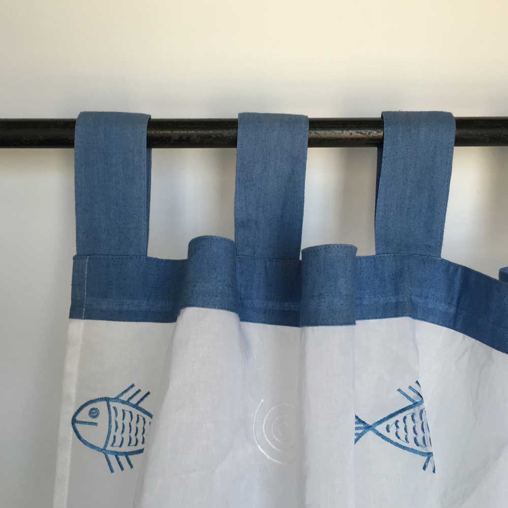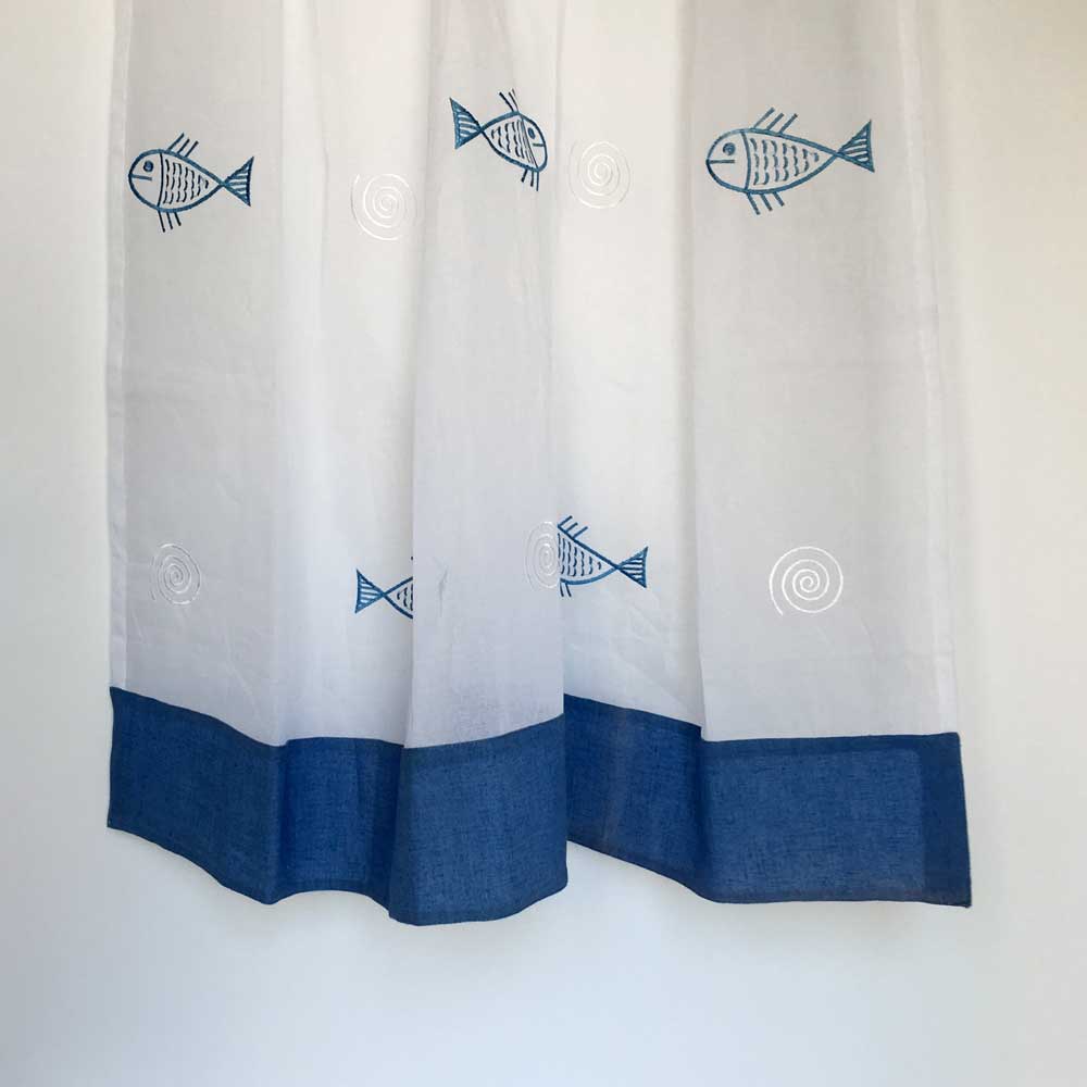 blue embroideredfish with 6 loops ready to hang on curtain rod 100% cotton organdi cool hand wash only do not bleach dry in shade wash dark colours separately